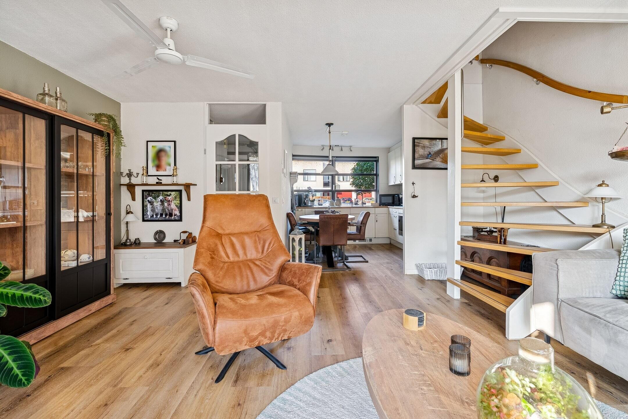De grote raampartij aan de voorkant van de woning maakt het zeer licht. De gehele begane grond is voorzien van een keurige wand- en vloerafwerking. Een prettige toevoeging is de airco op deze woonlaag. De trapopgang naar de 1e verdieping bevindt zich in de woonkamer.