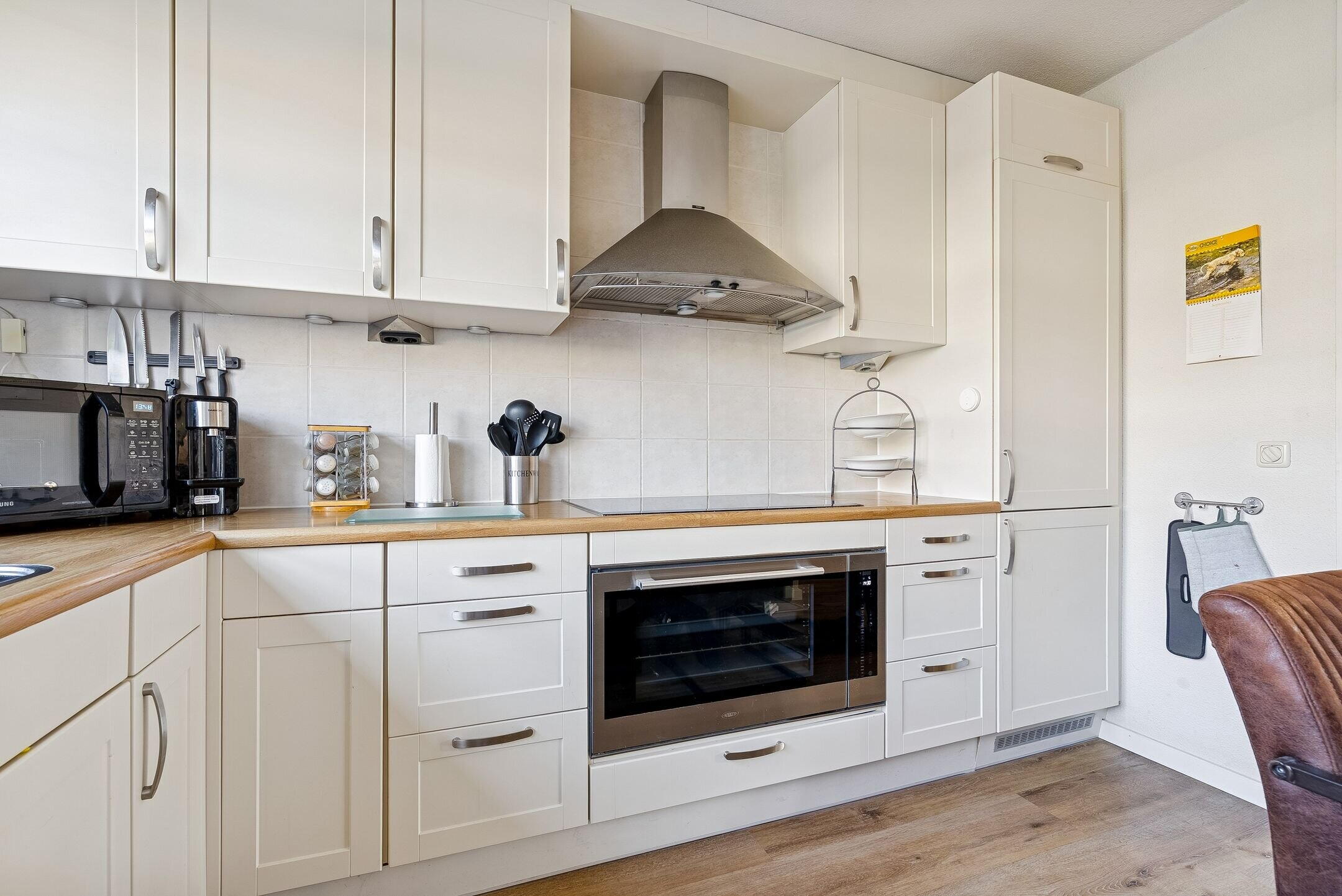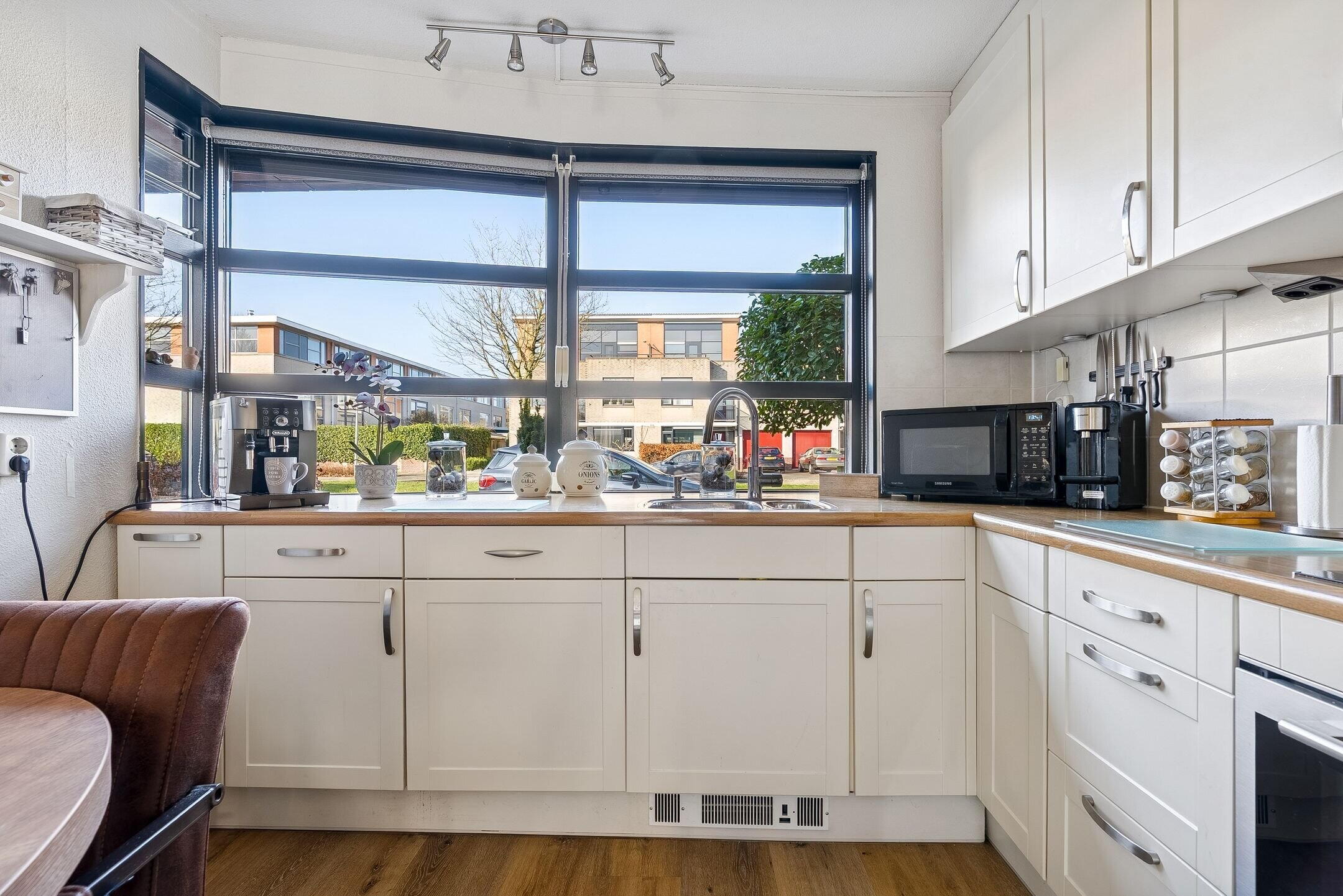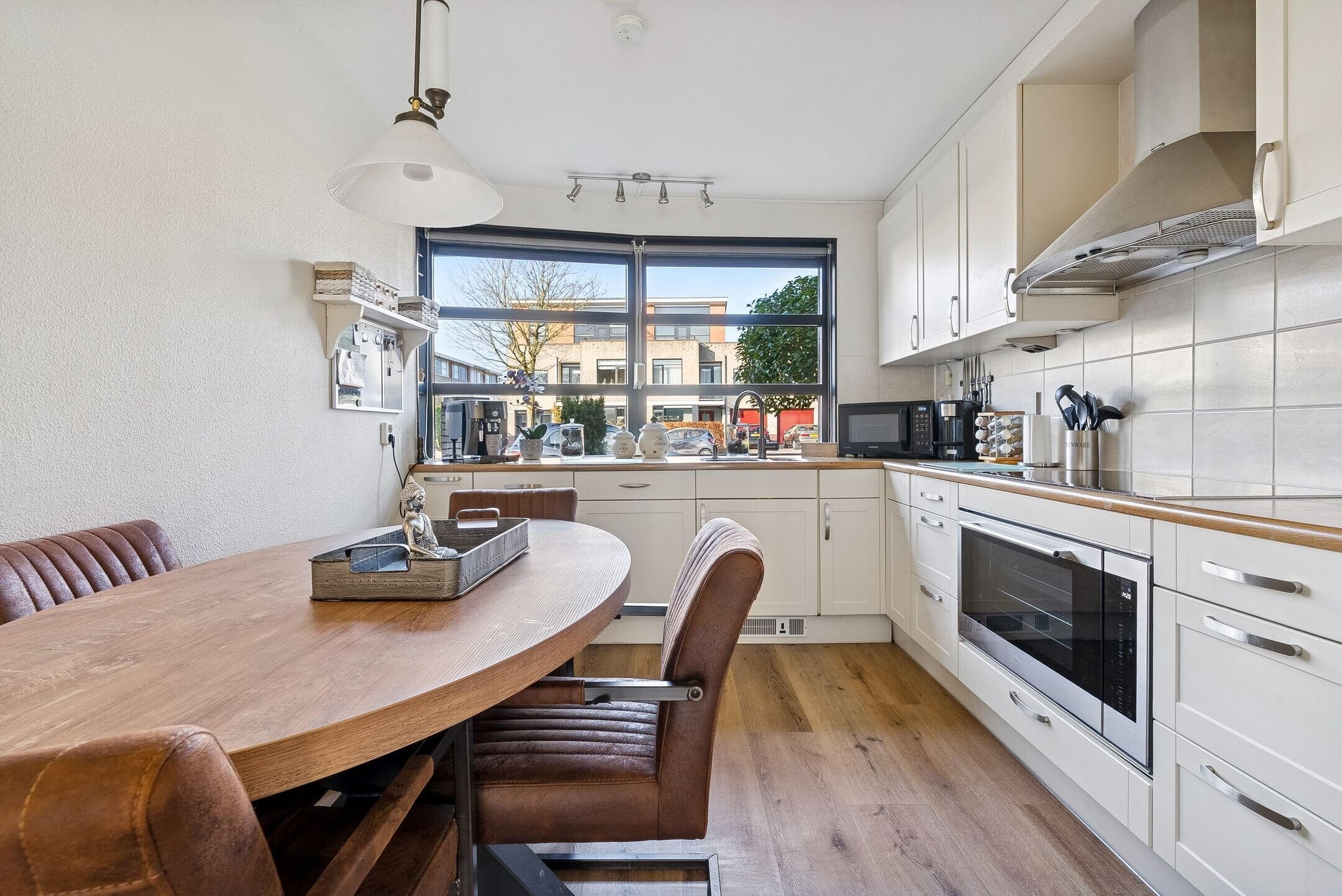 Aan de voorkant van de woning is de keuken gelegen. De keuken verkeert in goede staat en is voorzien van diverse inbouwapparatuur. De volgende inbouwapparatuur is aanwezig: koel-/vriescombinatie, grote oven, inductie kookplaat, afzuigkap en een vaatwasser. Dit alles maakt het een perfecte plek om heerlijk te kokkerellen.