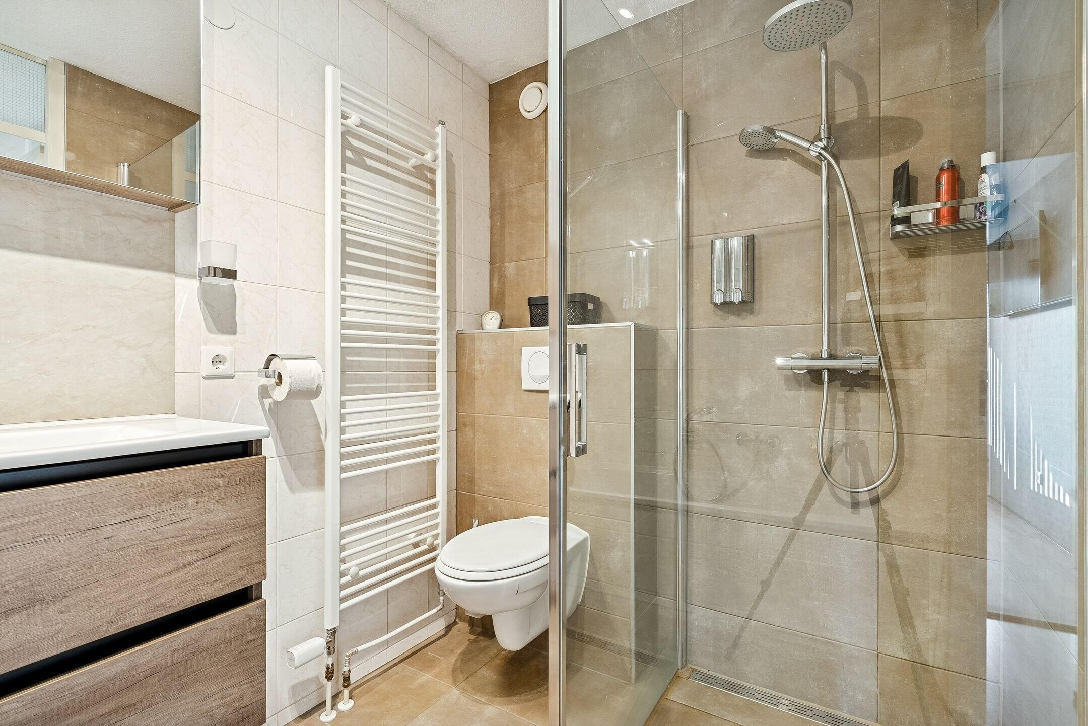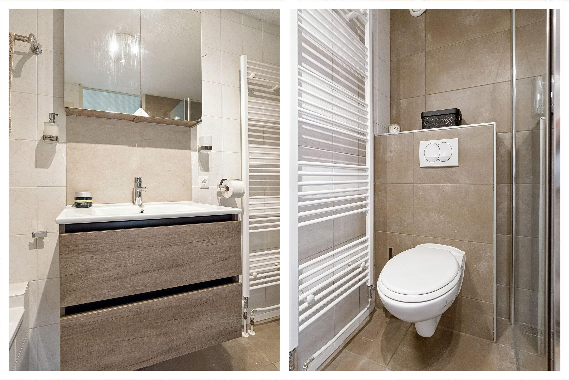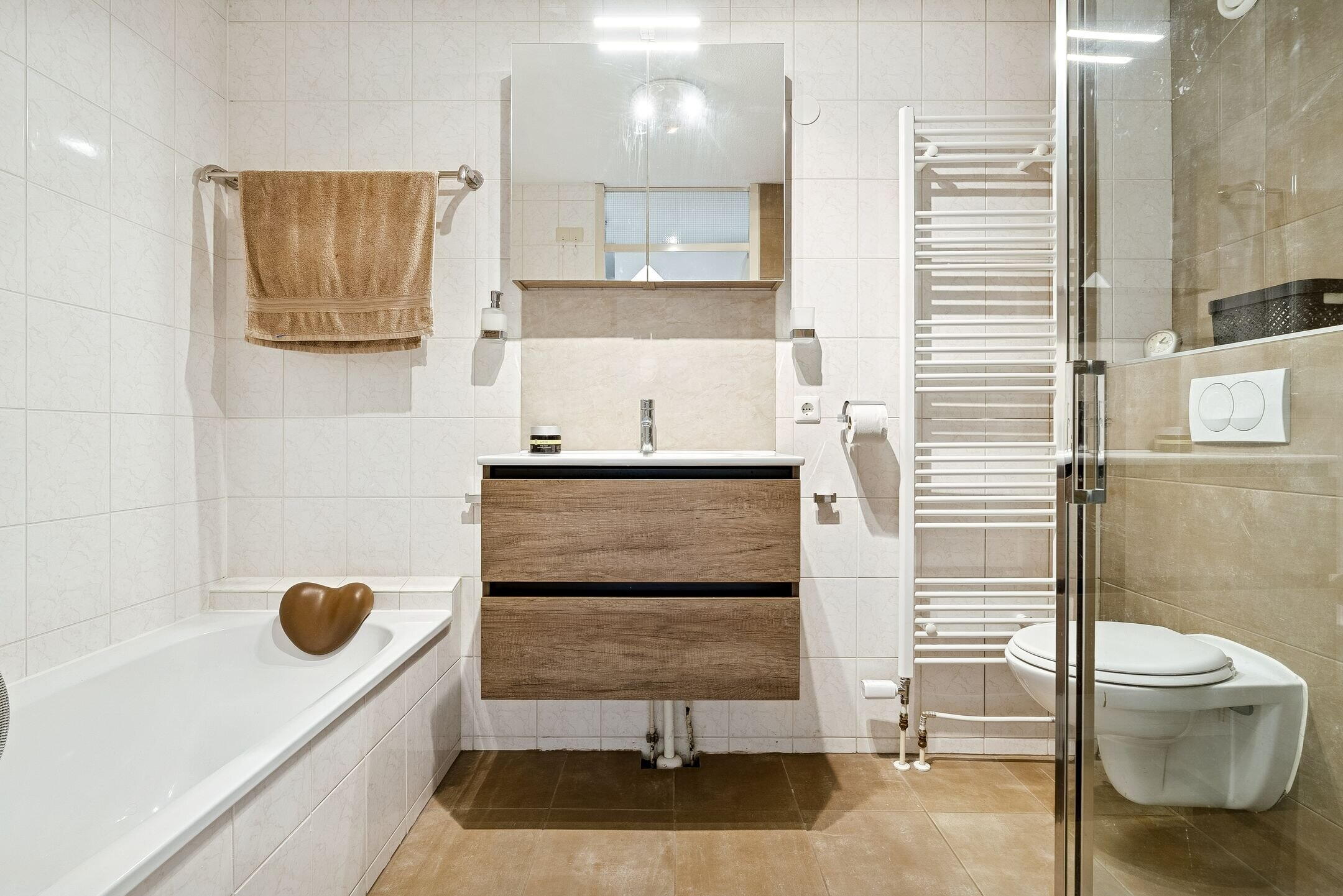 De badkamer is voorzien van een douchecabine, toilet, ligbad en wastafel. De mechanische ventilatie zorgt voor de afvoer van condens.