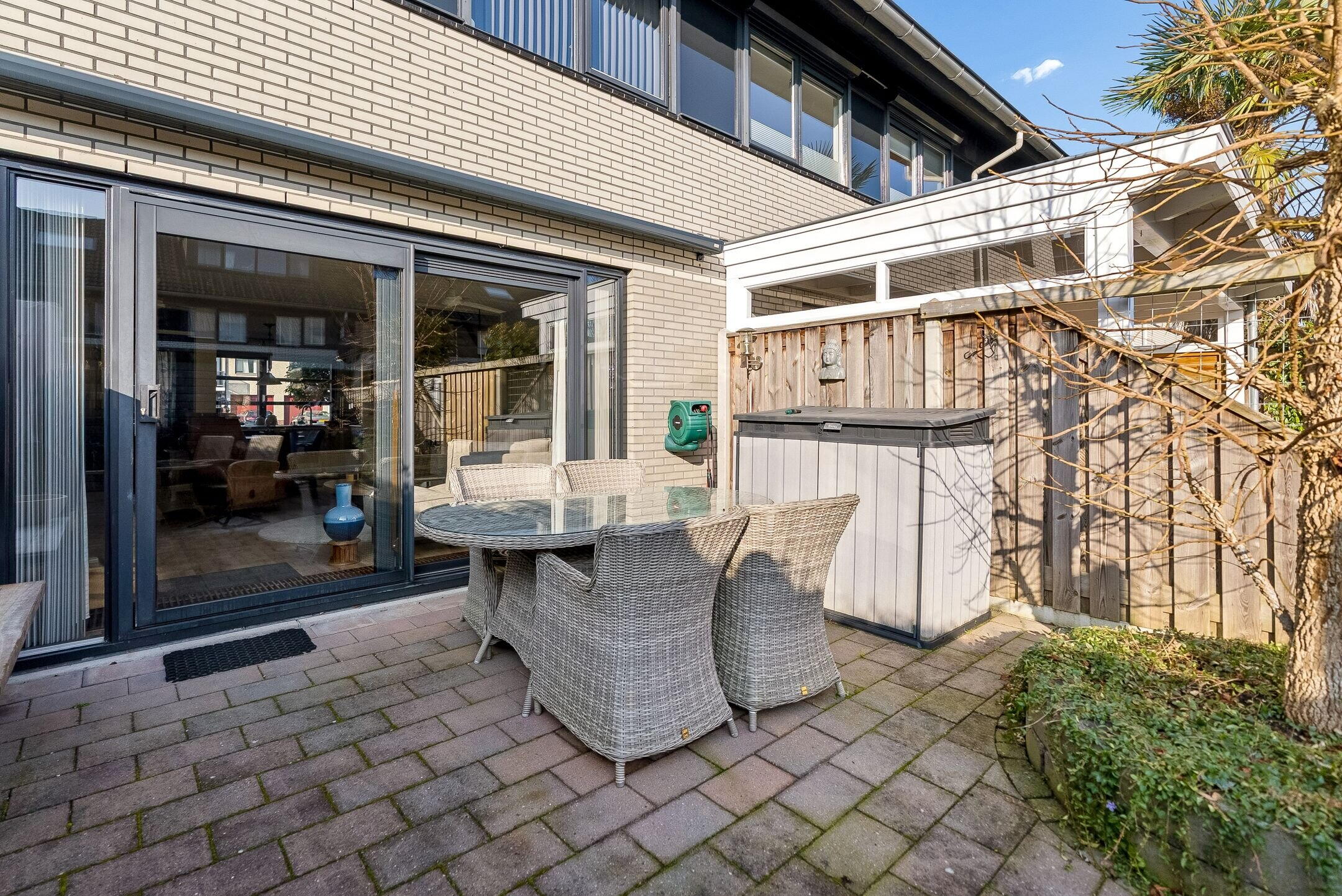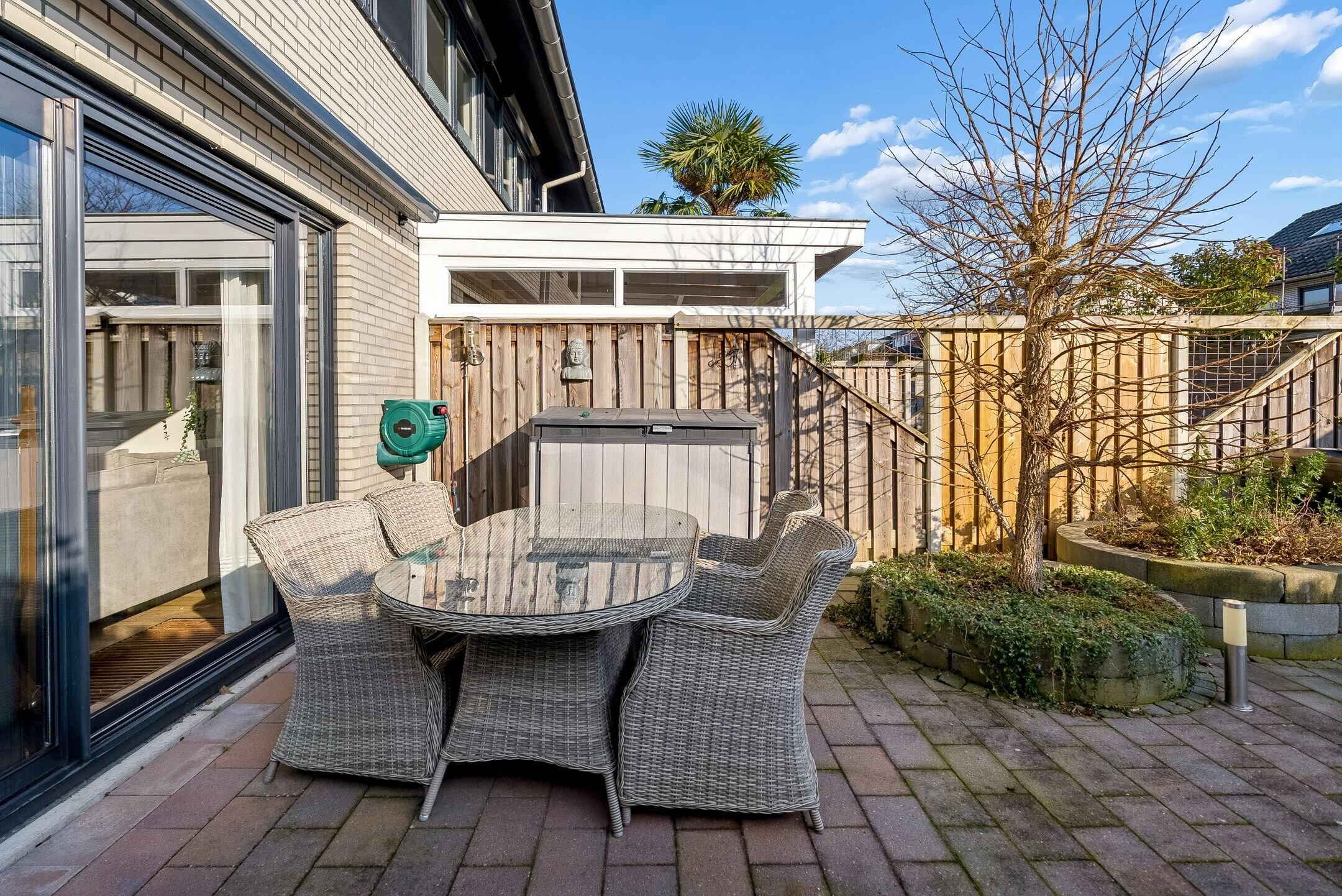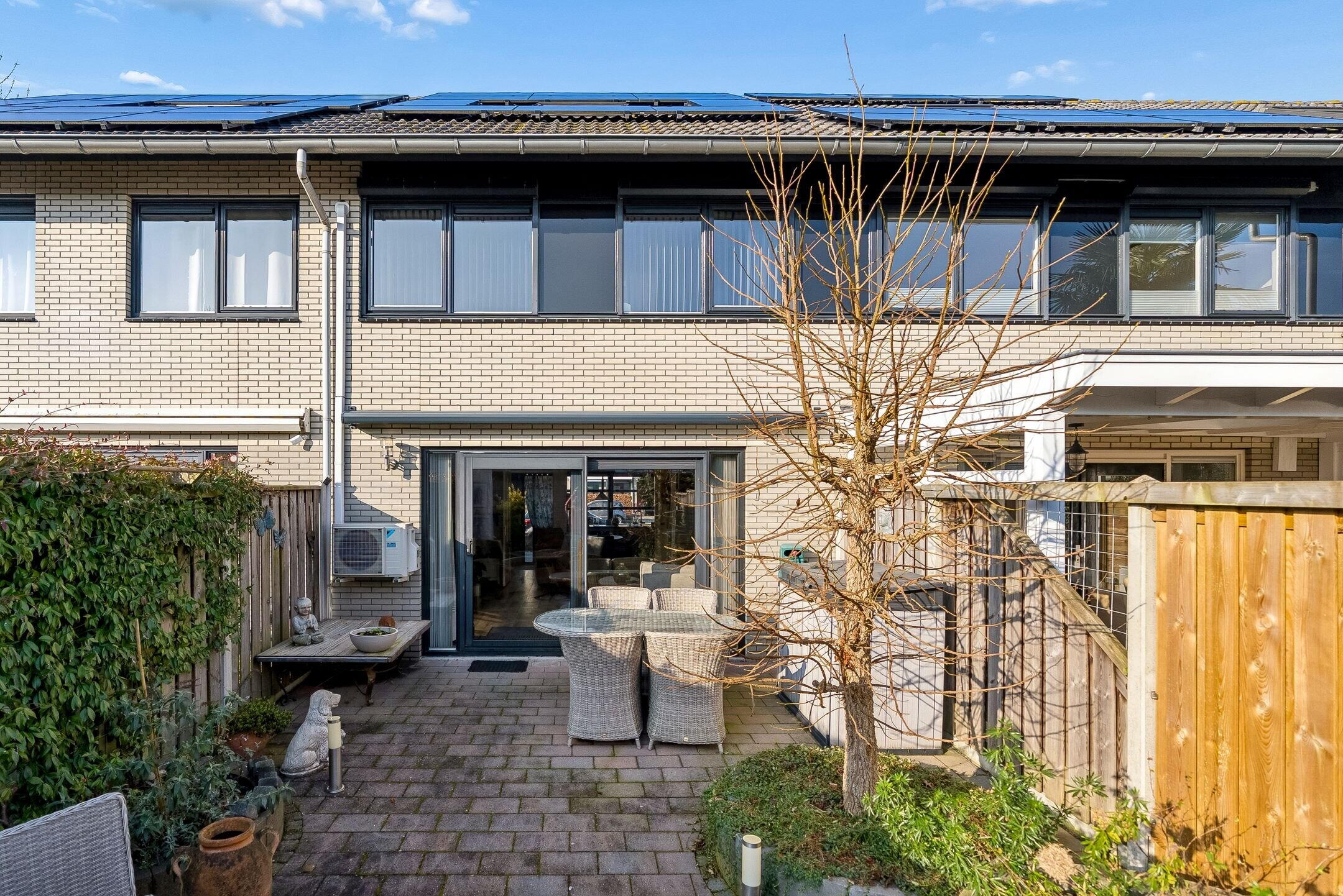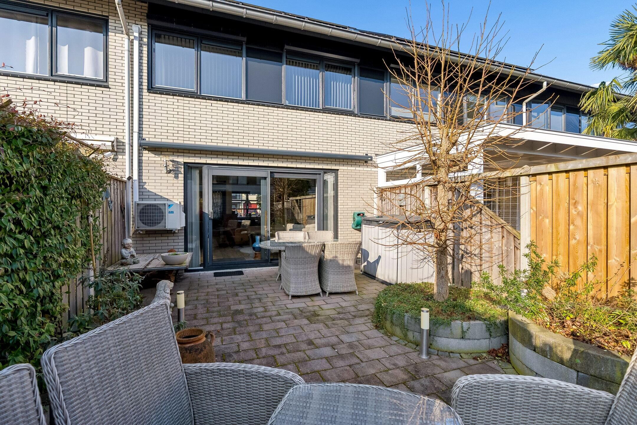 Aan de achterkant van de woning is een elektrisch zonnescherm aanwezig, deze zorgt dat de woning in de warme zomermaanden heerlijk koel blijft.